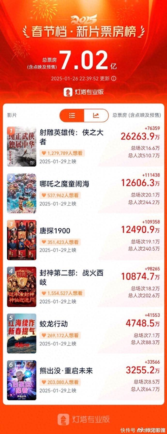 乌尔善《封神第二部:战火西岐》以超1.08亿票房占据第4位!