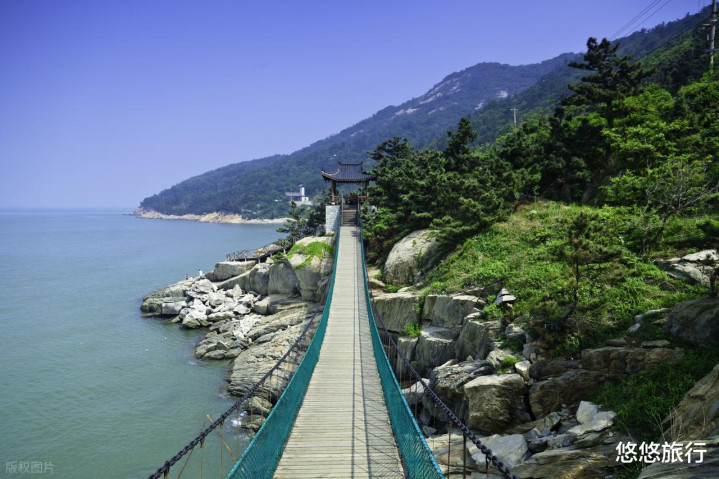 连岛沿着海边栈说念徒步,波浪拍打礁石。好天,蓝蓝的海水泛着波光。