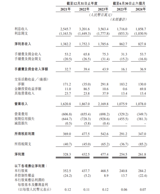 2021年、2022年、2023年、2024年1-6月,宜宾银行的营业收入诀别为1,620.8百万元、1,867.0百万元、2,169.8百万元、1,078.0百万元;净利润诀别为328.3百万元、432.5百万元、477.4百万元、261.8百万元;该行鼓舞应占净利润诀别为352.5百万元、437.7百万元、468.5百万元、284.2百万元。