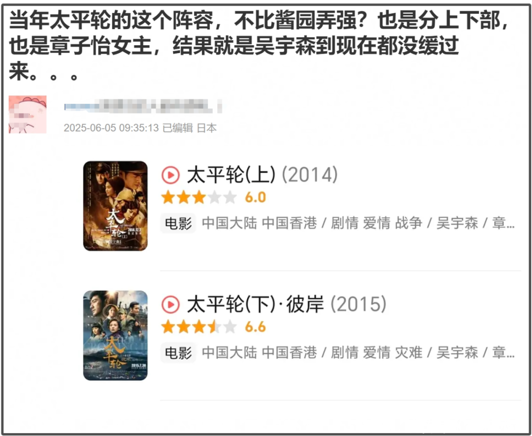 已往,由名导吴宇森捏导,章子怡主演的《太平轮》和如今的《酱园弄》同样分红了险峻部上映,效用票房扑街,投资血赔。《太平轮》的演员威望致使比《酱园弄》更强,但无论是何等豪华的演员威望王人救不了质料差的电影,但愿《酱园弄》不要重蹈《太平轮》的覆辙吧。