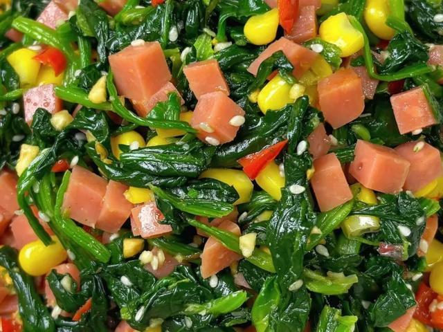 准备食材: 菠菜、火腿、玉米粒、蒜末、熟芝麻、小米辣。